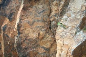Seguimos nuestro camino acercándonos a pequeñas cuevas, manchas que llaman nuestra atención hasta que de nuevo otros restos llaman nuestra atención. Una enorme grieta en las rocas que forma una especie de laberinto que en algunas partes está cerrado con paredes de varios metros de altura. Estamos en el Cofre de Malvacío.