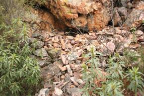 Está colmatado de abundante piedra que casi tapa su boca de mas de dos metros de altura. Se aprecian unos trazos rojos que intuyen figuras.