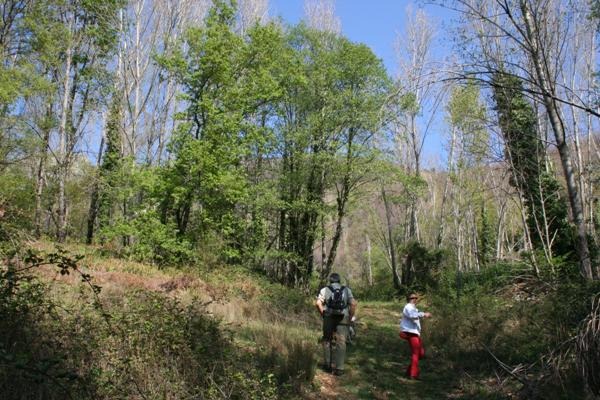 El camino lo cogemos bajando de la población por la carretera antigua. En la revuelta del aserradero hay un camino que sube paralelo al río. Ya es para empezar a disfrutar, casi todo transcurre a la sombra de grandes alisos, chopos, álamos..