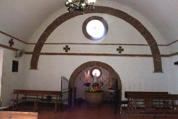 El interior está pintado de blanco en paredes y techos; sólo los cuatro arcos que sostienen la cubierta, toda la cúpula del presbiterio y un par de líneas cerca del techo marcan el rojizo del ladrillo que las forman.